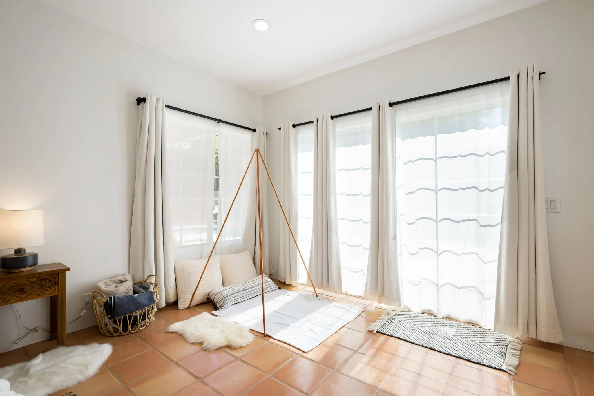 The second bedroom has a queen bed and its own entrance to the front yard, with a Jack & Jill style bathroom that connects to a third bedroom.