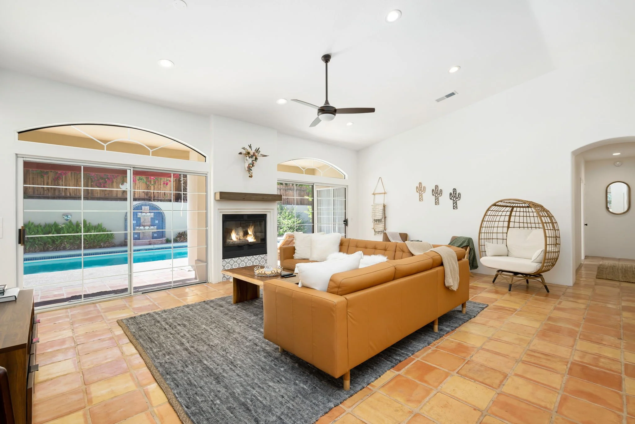 Relaxation is easy here, as there are multiple seating areas, an oversized couch, a cozy fireplace and high ceilings to create a warm and casual space for friends and family to enjoy.