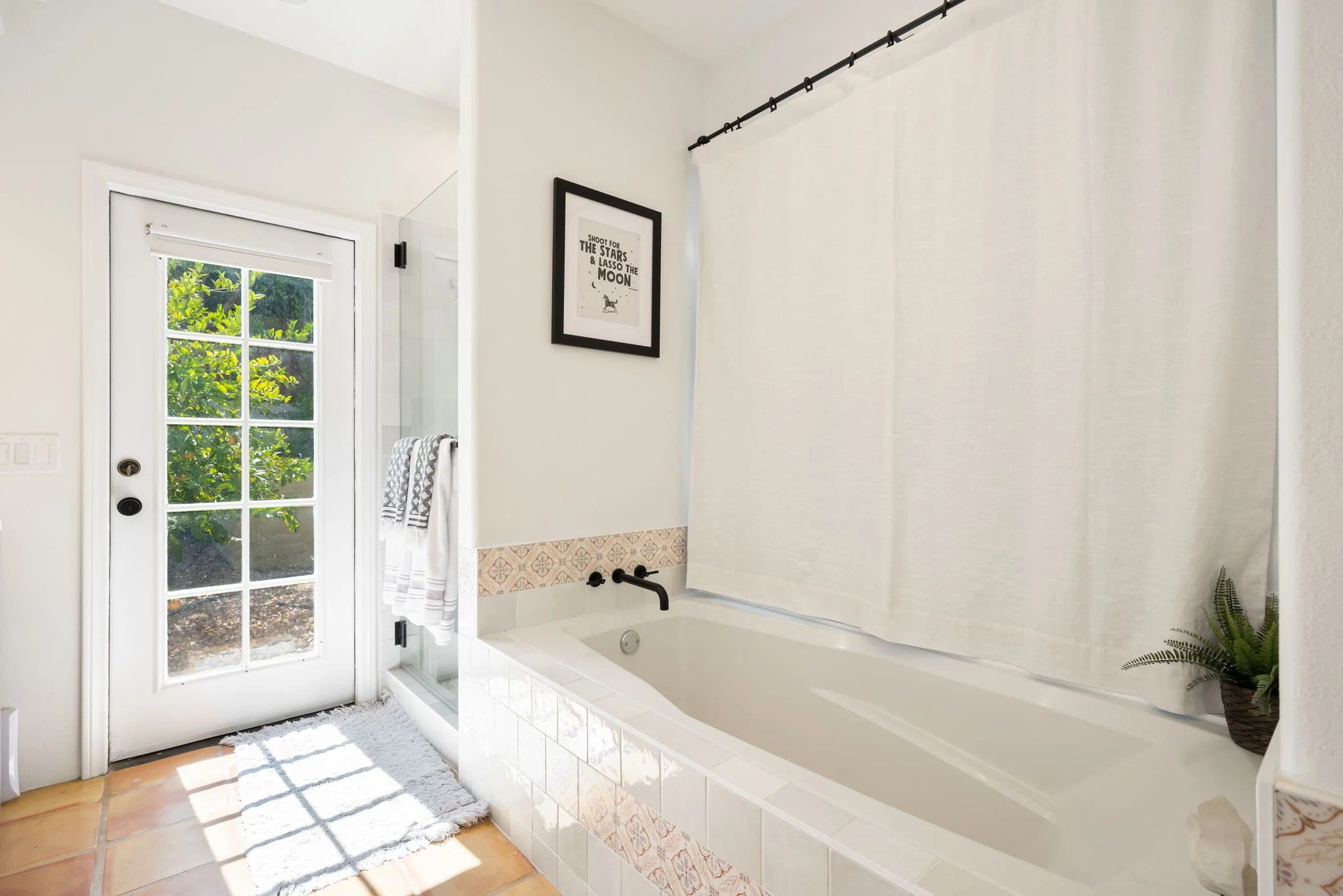 Oversized primary bedroom has a king sized bed, large walk in closet, two sink areas, and a large spa like tub in a newly remodeled bathroom, with two different entrances to the backyard.